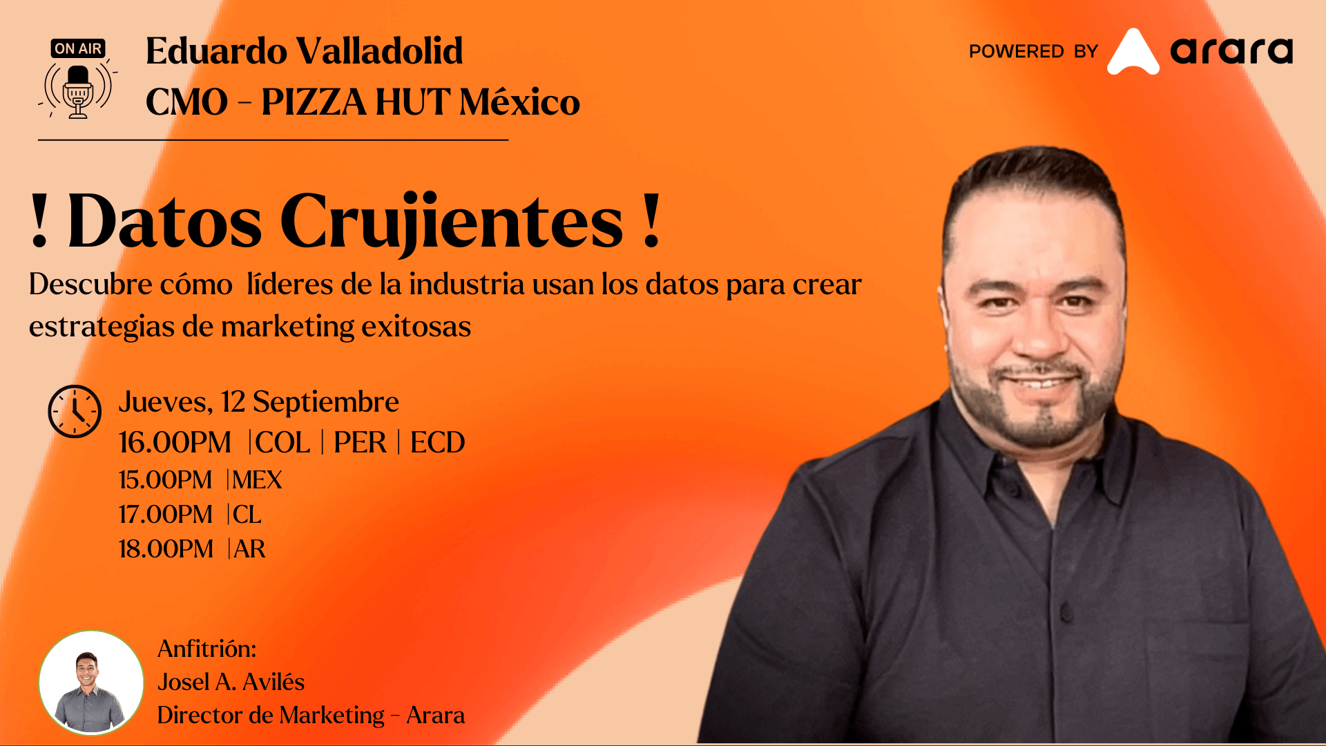 En este nuevo evento: DATOS CRUJIENTES! conversaremos con EDUARDO VALLADOLID, CMO de PIZZA HUT MEXICO, sobre cómo los grandes líderes de la industria están usando los datos para crear estrategias de marketing exitosas.
